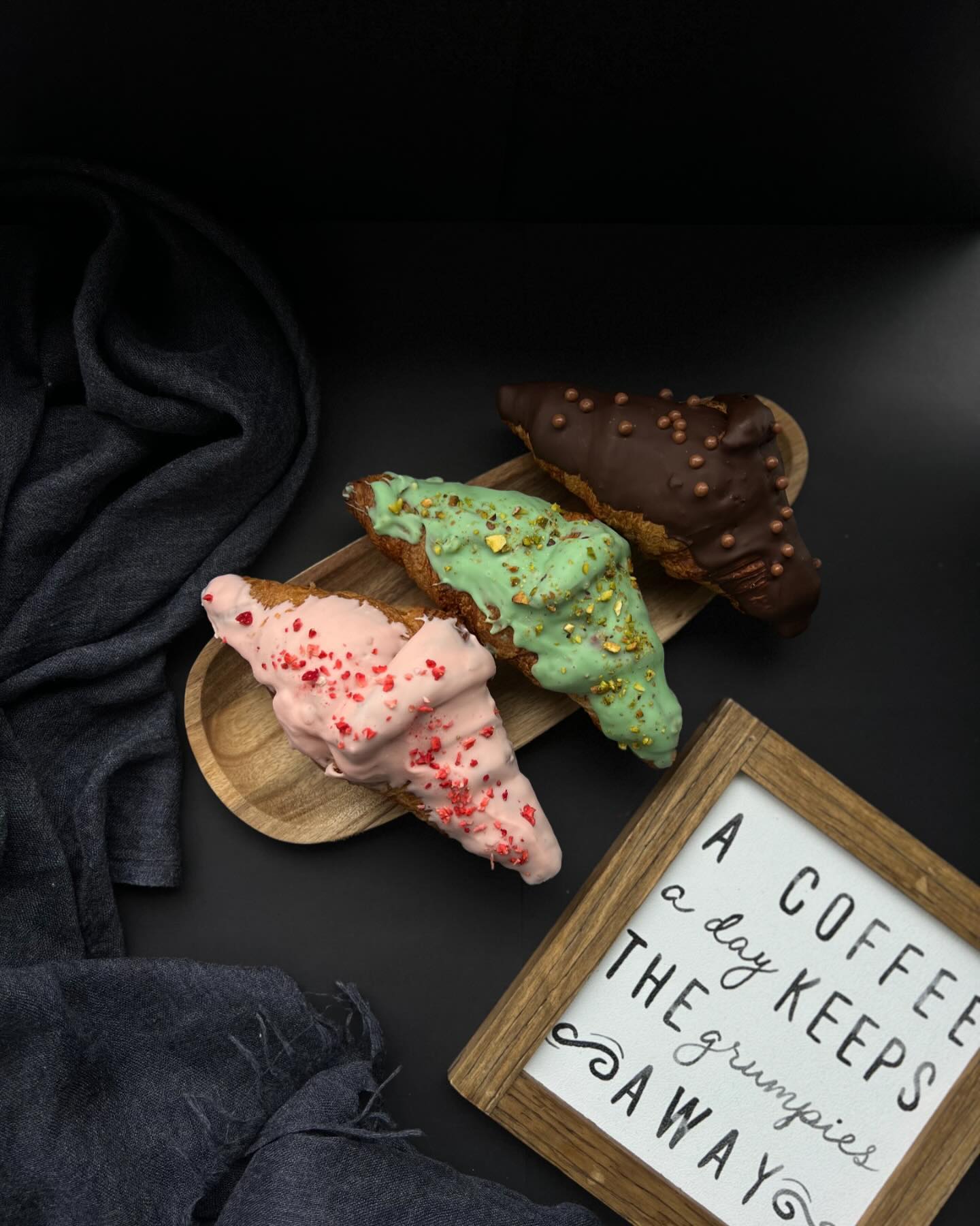 Indulge in a French classic with our Croissant. Each flaky pastry is wrapped in crushed pistachios, rich chocolate, or tangy raspberry, all with a consistent filling. Satisfy your cravings with this delicious treat.